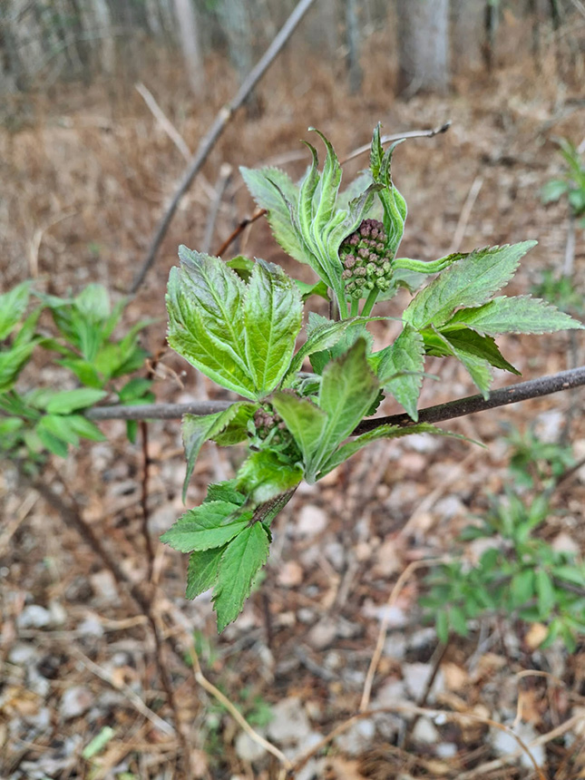 Red elderberry, also called red-berried elder, is a fast growing shrub rising on multiple stems from shallow roots and rhizomes. The stems are erect or arching, branching, hairless, up to 13′ tall, and up to 4¾″ in diameter at breast height. They are dotted with conspicuous, large, raised, warty bumps (lenticels). The bark on first year stems is gray and smooth. Bark on older stems is gray to reddish-brown and rough with thin, narrow, plate-like scales. The twigs are stout. The area of cells in the center of the stem (pith) is large, encompassing more than half of the diameter of the twig. First-year twigs greenish-brown and covered with short, soft hairs. Second-year twigs are grayish to brownish and hairless. The pith is white in first-year twigs, tan or orangish-brown in second-year twigs. There are no terminal buds. The leaves are opposite, deciduous, and pinnately divided into usually 5, occasionally 7, leaflets. They are attached to the twig on a 1¼″ to 2¾″ long leaf stalk. The leaf stalk is hairy on all surfaces. The leaflets are lance-shaped to egg-shaped or elliptic, 2″ to 4¾″ long, and ¾″ to 2″ wide. They are attached to the central leaf stalk (rachis) on ⅛″ to ⅝″ long stalks. They are rounded or tapered and asymmetrical at the base and taper to a point at the tip with concave sides along the tip. The terminal leaflet is often somewhat smaller than the lateral leaflets. The upper surface of the leaflet is dark green, and sparsely hairy, at least along the midvein. The lower surface is pale green and hairy along the veins. The margins have fine, sharp, forward-pointing teeth. The inflorescence is a branched, 1¼″ to 3⅛″ wide cluster (cyme) at the ends of the stems and branches. The cymes are pyramid-shaped or egg-shaped. They rise on erect, ¾″ to 3½″ long stalks. Each cyme has 100 to 200 small flowers. The flowers are ⅛″ to ¼″ wide. There are 5 yellowish-white petals and 5 stamens with white filaments and yellow anthers. They appear in late April to early June. The fruit is a juicy, globular berry, ⅛″ to ¼″ in diameter, containing 3 to 5 seeds. It ripens in mid-June to late July, turning bright red. |