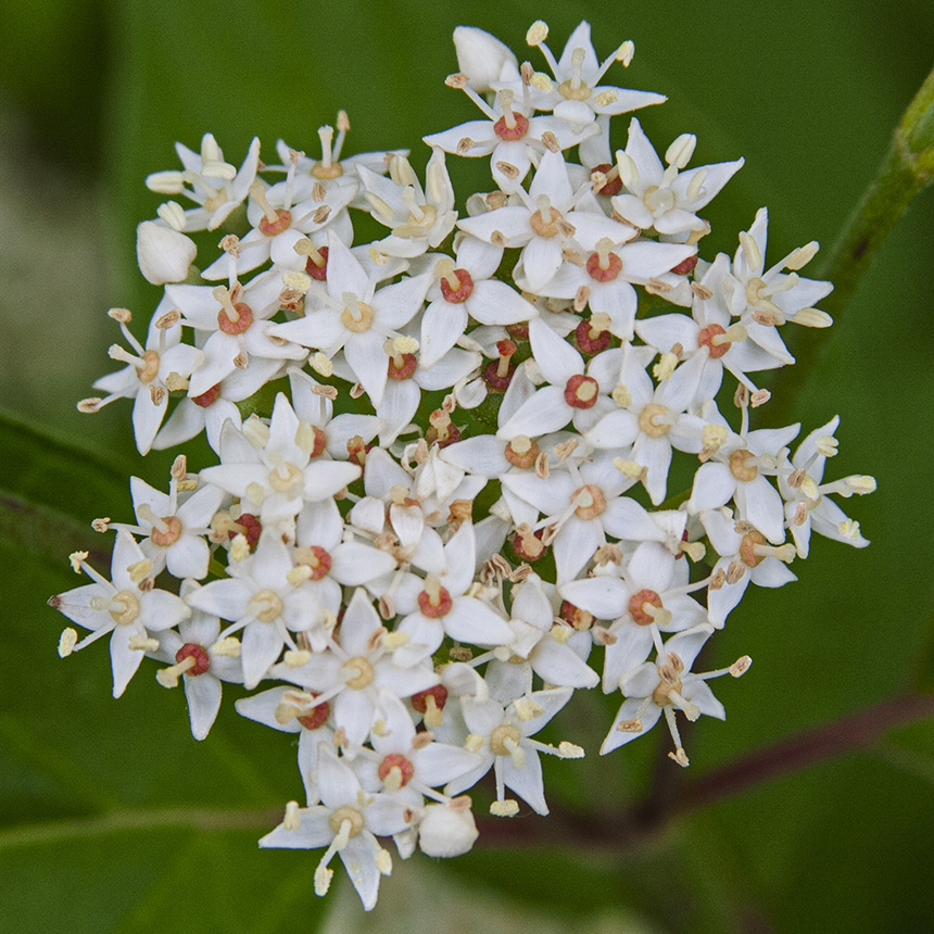 Red osier dogwood subspecies sericea, sometimes called American Dogwood, is an erect, perennial shrub that rises usually on multiple stems. It can be up to 13′ tall and up to 1¼″ in diameter, but is usually no more than 10′ in height. It rises from a shallow, branching, woody root system. Its form is highly dependent on its habitat. When growing in full sun, numerous stems form a dense, compact, rounded shrub about as wide as it is tall; the individual stems have many lateral branches; and the leaves are thicker and smaller. When growing in shade, numerous stems form open sprawling shrubs with few branches, and the leaves are thinner and larger. When growing in a dense grassy area the stems tend to be solitary and unbranched. Shrubs reproduce vegetatively in three ways. In a process called layering, shrubs produce stems that lie on the ground with only the tips ascending (decumbent). A decumbent stem roots at a node, produces an aerial stem, and eventually detaches, forming a new plant. Shrubs also produce aboveground runners (stolons) that root at the nodes and produce new plants. Stolons can be up to 10′ long. Finally, lower branches may droop to the ground, root at the tip, and send up a new shoot. Vegetative reproduction often results in dense thickets. Stems may be erect, arched, or decumbent, and are usually branched toward the top. In a colony, the middle stems tend to be upright while those on the periphery are arched, forming a rounded clump. First-year twigs are slightly hairy and and have a few raised, corky bumps (lenticels). They are dark red at first, sometimes green splotched with red, becoming greenish-red then grayish-green as the season progresses. They are not streaked or spotted. Second-year twigs are similar in color but hairless. In winter the twigs turn red. The common name of this plant refers to the color of the twigs in winter. The pith is white and solid. The leaf scars are narrow, U-shaped, and slightly raised. Each leaf scar has three bundle scars and is connected by a thin line to the leaf scar on the opposite side of the twig. The terminal bud is egg-shaped and is covered by two sharply pointed, abutting but not overlapping scales. The scales have whitish tips, appearing frosted. Lateral buds are similar but smaller. The bark is red, greenish-red, or yellowish-green, becoming red in winter. Older bark is light brown and rough. The leaves are opposite, deciduous, and evenly distributed along the branch. The leaf stalk is hairy and ⅜″ to 1″ long. The leaf blade is egg-shaped to elliptical, 2″ to 4⅓″ long, and 1″ to 2⅜″ wide. It is rounded or tapered at the base and tapered to a sharp point at the tip, usually with concave sides along the tip. On each side of the midrib there are usually 5 or 6, occasionally 7, conspicuous veins that curve upward toward the tip of the leaf. The veins are depressed on the upper leaf surface, giving the leaf a puckered appearance. The upper surface is dark green and covered with short, straight, appressed hairs; longer, soft, spreading hairs; or both. The lower surface is whitish due to a waxy film (glaucous), but is otherwise similar to the upper surface. The margins are untoothed. The leaves turn red to purple in the fall. The inflorescence is a dense, flat-topped to shallowly convex, branched, ¾″to 2¾″ in diameter, ⅝″ to 1¼″ tall cluster (cyme) of 35 to 150 flowers at the ends of branches. The flowers are on hairy, 1 ⁄16″ to ¼″ long stalks (pedicels). The flowers appear twice each season, first in mid-May to early June, then again in July to mid-August. Each flower has four sepals, four petals, four stamens, and a well-developed style. The sepals are fused for most of their length and separated at the tip into four minute teeth. The petals are creamy white, narrowly oblong lance-shaped, and ⅛″ to 3 ⁄16″ long. The stamens are longer than the petals. The flowers are fragrant. The fruit is a berry-like, 3 ⁄16″ to 5⁄16″ in diameter drupe with one seed. It is green initially, turning white as it matures. It matures in early July (first fruiting) to mid-September (second fruiting). The pedicels persist, remaining on the plant in winter. |