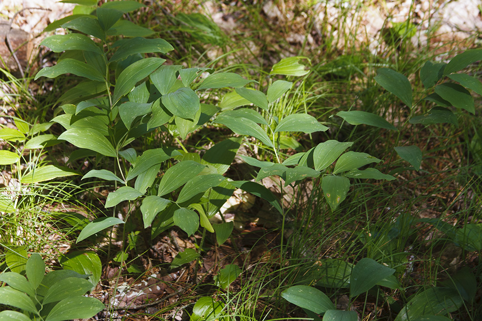 Smooth Solomon’s seal (Polygonatum biflorum var. commutatum) is a taller plant, reaching up to 48″ at maturity. The stems are hairless, unbranched, and do not zigzag. The leaves sometimes clasp the stem. The leaves have 7 to 19, parallel veins. The inflorescences are small clusters of 2 to 15 cylinder-shaped flowers. The peduncles are not strongly bent backward. The fruits are dark blue-violet when mature. |