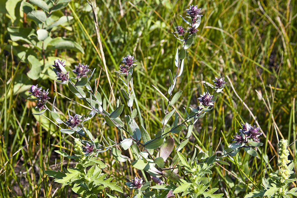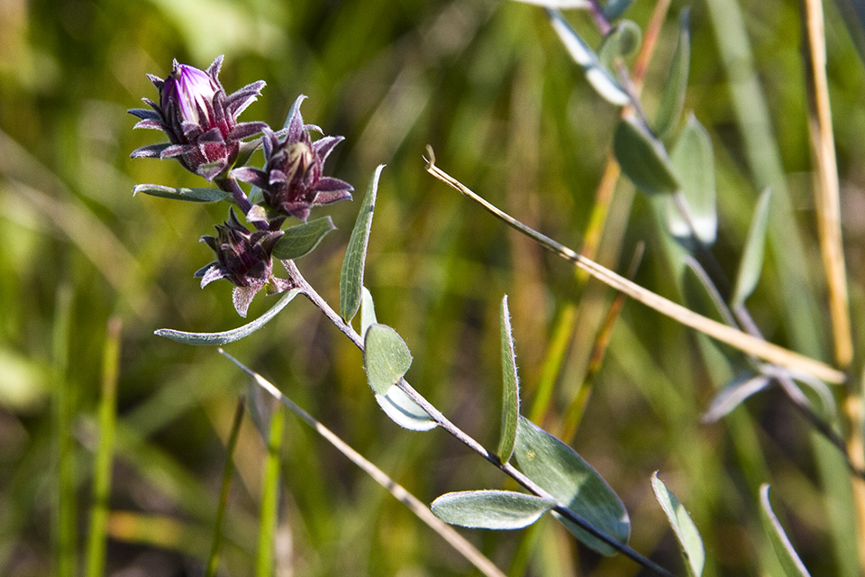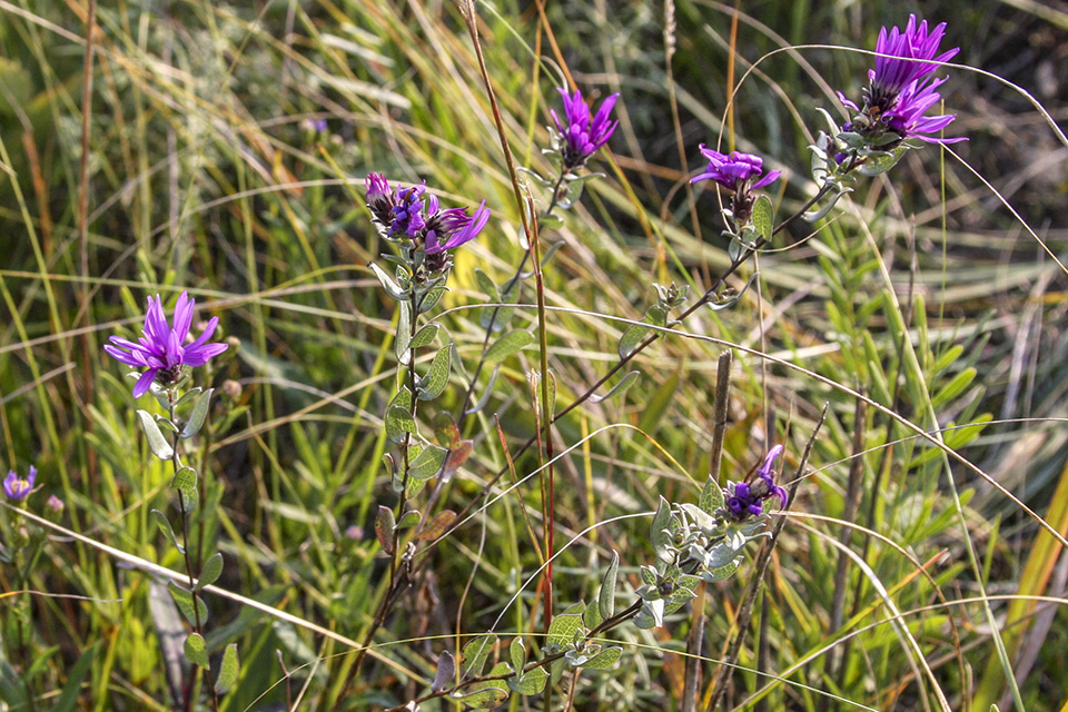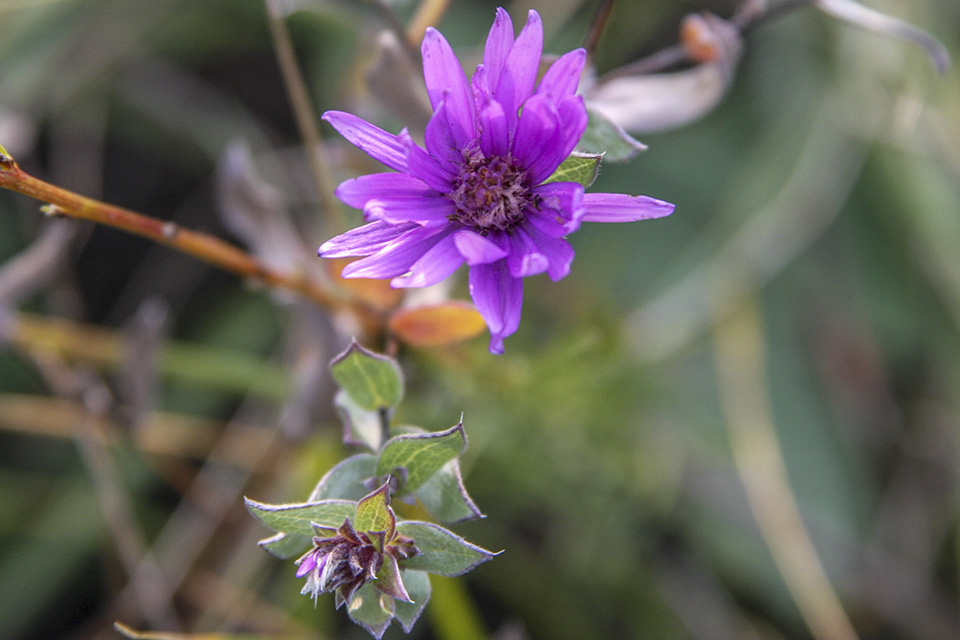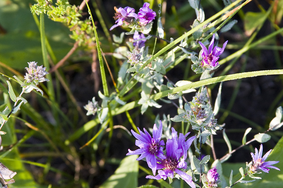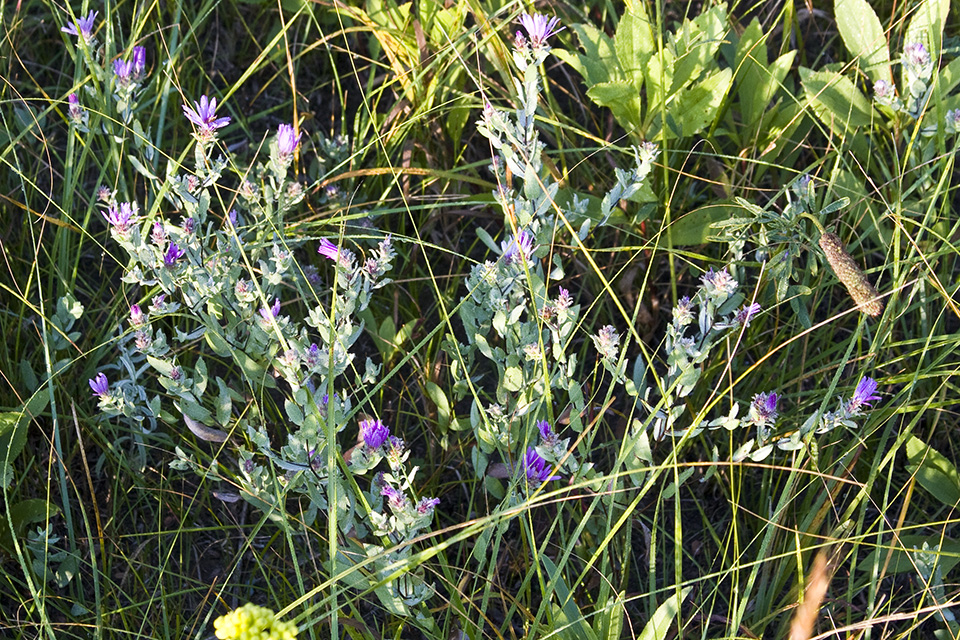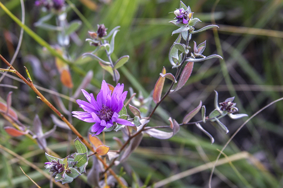 This is the only aster with leaves whitish-green due to a dense covering of silky hairs. |