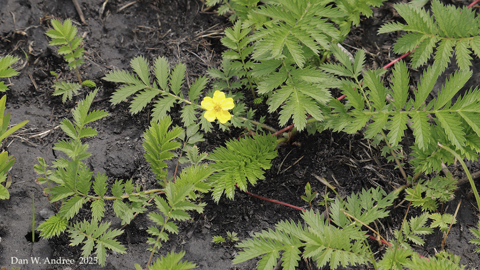 Silverweed is a 2″ to 8″ tall, ascending to erect, perennial forb that rises on basal leaves from a narrow, often branched taproot. It first appears as a dense cluster (rosette) of basal leaves. Soon it produces one or more above-ground, creeping, widely spreading runners (stolons). Basal leaves are inversely lance-shaped in outline (widest toward the tip), up to 10″ long, and up to 4″ wide, rarely longer and usually much smaller. They are on 1″ to 10″ long leaf stalks. Each leaf is pinnately divided into 5 to 31 primary leaflets which often alternate with much smaller secondary leaflets. The leaf axis (rachis) is light green and covered with long, soft, shaggy, sometimes spreading hairs. The leaflets are oblong or inversely egg-shaped. The larger leaflets are up to 2″ long and ¾″ wide, sometimes larger. The lower leaflets are much smaller. The upper surface is green and may be hairless or covered with long, silky, somewhat appressed hairs. The lower surface is white. It is densely covered with short, white, matted or tangled hairs, and moderately to densely covered with long silky hairs. The margins are deeply toothed with sharp, forward pointing teeth. There are usually 5 to 8, but as many as 11 or more teeth per side. The stolons are 12″ to 36″ long with leafy nodes every 4″ to 6″ long. Node leaves are similar to basal leave but smaller. Stolons are red and are covered with long, soft, shaggy, sometimes spreading hairs. They send down roots from the nodes which often creates new plants. The inflorescence is a single flower rising from a stolon node on an ascending to erect, hairy, 2″ to 6″ long stalk (pedicel). The flowers are ⅜″ to ¾″ in diameter. There are 5 modified leaves (epicalyx bractlets), 5 sepals, 5 petals, 20 to 25 stamens, and 20 to 200 or more pistils. The epicalyx bractlets are green, narrowly to broadly egg-shaped to triangular, often toothed, and about the same size as the sepals. They alternate with the sepals and are hidden below the petals when the flower is viewed from above. The sepals are ⅛″ to ⅜″ long and are densely covered with whitish, silky hairs. The petals are yellow, inversely egg-shaped or oval, 3 ⁄16″ to ⅝″ long or longer, and ⅛″ to ⅜″ wide. The petals are longer than the sepals. The stamens have yellow, 1 ⁄16″ to ⅛″ long filaments and yellow anthers. The fruit is a 1 ⁄16″ long seed capsule (achene) with a groove on the upper (dorsal) surface. |