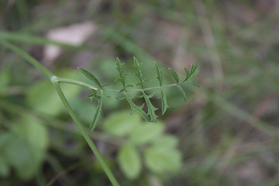 Solidstem burnet saxifrage is a 12″ to 32″ tall, erect, perennial forb that rises on one to several stems from a dark, thick, branched, semi-woody taproot. The stems are branched, round, and hollow when young but soon becoming filled with pith. They are very slightly ribbed, more so near the bottom, and are densely covered with very short hairs. The leaves are alternate. Basal leaves are oval in outline and up to 12″ long. They are pinnately divided (once-pinnate) into several pairs of opposite leaflets and a terminal leaflet. The central axis (rachis) is short-hairy. The leaflets are broadly egg-shaped to almost round and are covered with short hairs. They are coarsely toothed and sometimes shallowly lobed. The terminal leaflet is often deeply lobed. Lower stem leaves are similar but smaller, and become even smaller and less divided as they ascend the stem. Middle stem leaves are pinnately divided into several segments. Each segment is again pinnately divided (twice pinnate) into several narrow, pointed lobes. The lobes are often themselves lobed. Upper stem leaves are much smaller. They are once-pinnate with narrow, widely-separated leaflets. The leaf stalk forms a sheath at the base that wraps around the stem. Sometimes only the sheath is present and the sheath may have one or more small leaflets at the tip. The sheaths are noticeably grooved lengthwise (striate) and often turn purplish. The inflorescence is a compound, umbrella-shaped cluster (umbel) at the end of the stem and each branch. The umbel is stalked, round, more or less flat-topped, and ¾″ to 2″ in diameter. It has 8 to 20 slender branches (rays). The rays are ⅜″to 1¾″ long and hairless. At the end of each ray is a smaller, secondary umbel (umbellet). There are no modified leaves (bracts) at the base of the umbel and no secondary bracts (bracteoles) at the base of the umbellets. There are 6 to 20 individual flowers in each umbellet. The flowers are about 3 ⁄16″ (5 mm) wide. Inner flowers of the umbellet are symmetrical on every plane, like a starfish (actinomorphic). Outer flowers are sometimes symmetrical on only one plane (zygomorphic). There are sometimes 1 or more minute sepals, but usually there are none. There are 5 petals, 5 stamens, and 2 styles. The petals are white, sometimes tinged with pink, and inversely egg-shaped. The tip of each petal curves deeply inward, making the petal appear notched when viewed at a distance. The underside is hairy. The styles are white and straight. They spread out widely from the base like the arms of a TV antenna of the 1960s. They are shorter than the petals when in flower, elongating as the fruit develops, then dropping off when the fruit ripens. The fruit is dry, dark brown, broadly egg-shaped to elliptic, 1 ⁄16″ to ⅛″ (2 to 2.5 mm) long capsule containing 2 seeds. |