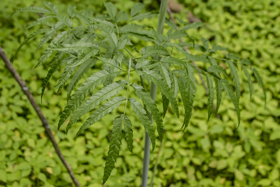 Spotted water hemlock is a perennial herb that can grow up to 6 feet tall. It has hollow stems with purple blotches and compound leaves that are divided into several leaflets. The flowers are small and white, arranged in umbrella-shaped clusters at the top of the stem. The radial veins of each leaflet extend to the notches in the leaflet margin, not to the tips of the teeth as in other members of the carrot family. There are four currently recognized varieties of spotted water hemlock. They are distinguished by the shape of the leaves, by the toothed leaf margins, and by characteristics of the fruits. The leaf characteristics intergrade completely between the varieties. To reliably distinguish between the varieties, it is important to closely examine ripe fruit. |