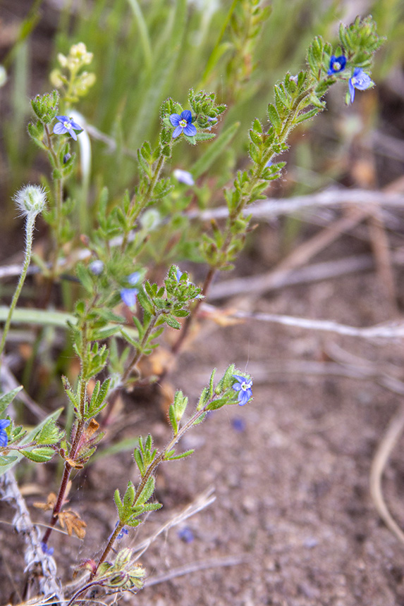 Spring speedwell is an uncommon but rapidly spreading exotic weed. It is native to Europe, Asia, the Indian subcontinent, and Morocco. It was introduced into North America and is now naturalized and rapidly spreading in two widely separated ranges. The eastern population is in the upper Midwest from Ohio to Minnesota and in Canada from New Brunswick to Ontario. The western population is from Washington to Wyoming and in British Columbia. It is uncommon throughout its range, currently rare in Minnesota. It is found in meadows, pastures, lawns, roadsides, trailsides, campgrounds, and parking lots. It grows in full sun in dry, sandy, gravelly, and rocky places with poor soil where it receives reduced competition form other species. It is difficult to see when standing upright, is easily overlooked due to its small size, and is very similar in appearance to the much more common corn speedwell. For these reasons, it is probably under-reported. Spring speedwell is an erect, annual forb that rises on a single stem from a taproot. It can be 2″ to 10″ tall but in Minnesota it is usually no more than 6″ in height. The stem is usually unbranched but sometimes has a few branches near the base that curve upward becoming more or less parallel to the main stem. It is moderately covered with white, curly, non-glandular hairs and also with gland-tipped hairs, especially in the inflorescence. The leaves below the inflorescence are opposite while the leaf-like appendages (bracts) within the inflorescence are alternate. Leaves on the lower stem are short-stalked, while those in the middle and above are stalkless. The leaf blades are egg-shaped (widest below the middle) to broadly elliptic (widest at the middle), 3 ⁄16″ to ½″ (5 to 12 mm) long, ⅛″ to ¼″ (4 to 7 mm) wide. Many leaves have 2 to 6 narrow lateral lobes, shallow lobes on the lower leaves, very deep lobes on the upper leaves. The upper and lower surfaces are moderately covered with both short, stiff, non-glandular hairs and spreading, gland-tipped hairs. The margins may be toothless or have a few shallow, rounded teeth. The lower leaves wither, turn brown, and fall away as the plant matures. The inflorescence is a moderately dense, unbranched arrangement (raceme) of many flowers at the end of the stem and branches. Each flower is on a short, 1 ⁄64″ to ⅛″ (0.5 to 2.5 mm) long stalk. At the base of each pedicel there is a single bract. Lower bracts are lance-shaped and lobed. Upper bracts are long and straight-sided (linear), unlobed, and untoothed. Each flower is 1 ⁄16″ to ⅛″ (2 to 4 mm) wide. There are 4 outer floral leaves (sepals), 4 petals, and 2 stamens. The sepals are green, ⅛″ to 3 ⁄16″ (3 to 5 mm) long, and covered with gland-tipped hairs. They are fused at the base into a short calyx tube, then separated into 4 narrowly lance-shaped lobes. The petals are medium blue with dark veins, about half as long as the sepals, and fragile, easily knocked off the plant. The upper and lateral petals are round to egg-shaped and about equal in size, the lower petal is much narrower. The stamens are shorter than the petals, the stalks (filaments) only 1 ⁄64″ long (0.5 to 0.6 mm) long. The fruit is a ⅛″ (3 mm) long, ⅛″ (4 mm) wide capsule with about 8 tiny seeds. The capsule is yellowish-brown, heart-shaped, flattened, and covered with gland-tipped hairs. |