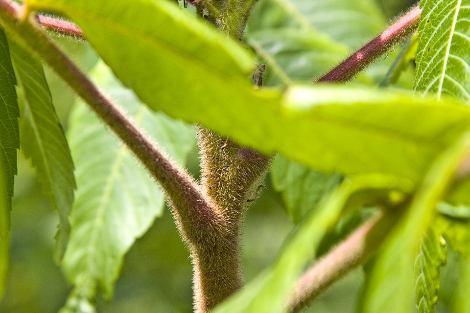 Smooth sumac (Rhus glabra) branches, twigs, and rachis are hairless. The drupes are hairless but densely covered with short, nipple-like bumps. |