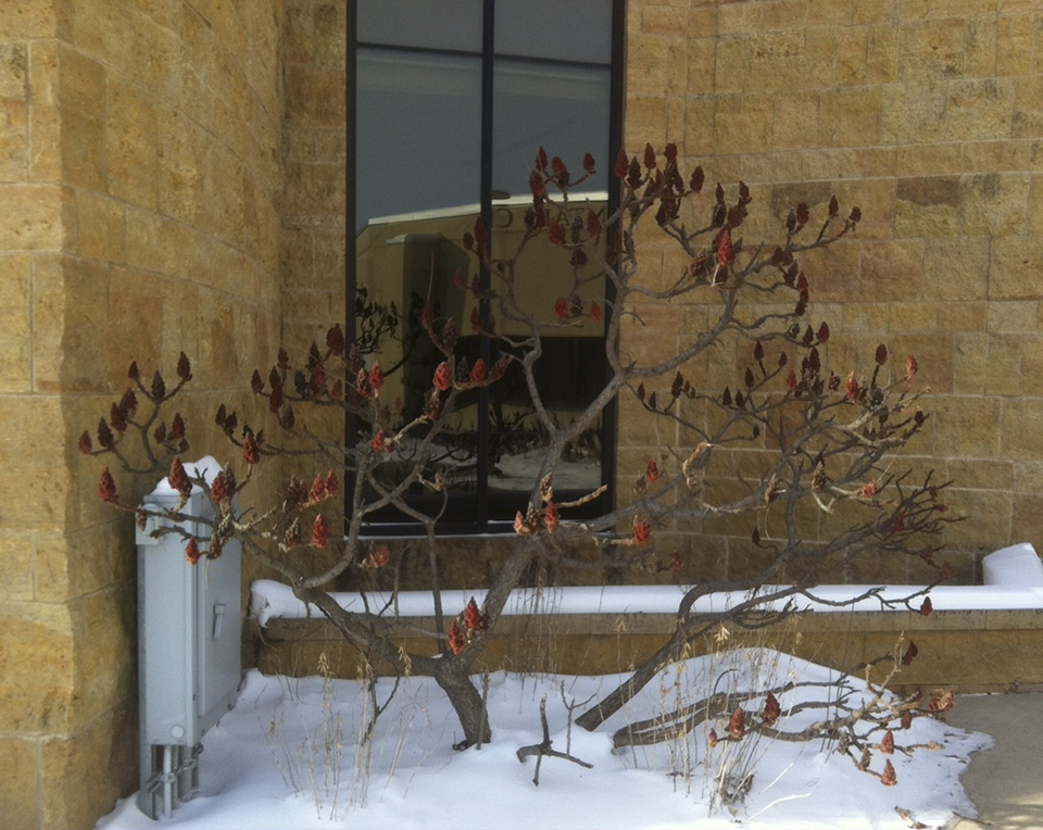Staghorn sumac as a foundation planting, December 2016, Freeborn County, MN |