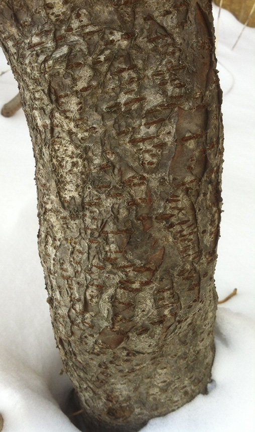 Staghorn sumac is a fast-growing, 4′ to 15′ tall shrub or, rarely, small tree. It rises on a single trunk from long-creeping branched rhizomes. In Minnesota mature plants are usually 4′ to 15′ tall and 2″ to 4″ in diameter. Large individuals can reach over 32′ in height and 8″ in diameter. It often forms dense colonies with the oldest and tallest individuals in the center surrounded by progressively younger and shorter individuals. It is a short-lived tree, usually surviving no more than 50 years. The trunk is forked and occasionally branched. The crown is open, irregular, and rounded or flat-topped. The bark on young parts is thin, smooth, and dark brown to yellowish-brown with prominent lenticels. As it ages it becomes slightly scaly. The upper branchlets are densely covered with with short, brown, hairs. The lower trunk and branches are hairless and woody. In winter the leafless, velvety branches have the appearance of antlers on a buck deer, giving the plant its common name. The twigs are very stout, tan to slightly reddish, and densely hairy. Older branches have prominent lenticels, while younger branches and twigs do not. When broken the branches exude a yellowish sap. There is no terminal bud—the branches end in a cluster of fruits or a dead stub. The lateral buds are cone-shaped, 3 ⁄16″ to ¼″ long, and covered with pale brown, velvety hairs. The leaf scar is crescent or horse-shoe shaped and has 3 bundle scars. The leaf scar almost completely surrounds the bud. The leaves are deciduous, alternate, and pinnately compound. They are 12″ to 24″ long and are divided into 11 to 31 leaflets. They are on 1¼″ to 4″ long, densely woolly or felty leaf stalks. The central stalk of the leaf to which the leaflets are attached is slightly reddish and densely hairy and is not winged. The leaflets are stalkless or on very short stalks. They are arranged in opposite or slightly alternate pairs with 1 terminal leaflet. They are lance-shaped, 2″ to 4¾″ long, and ¾″ to 1¾″ wide. They are rounded or slightly heart-shaped at the base and taper to a long point at the tip. The upper surface is dark green and nearly hairless. The lower surface is pale green to sometimes nearly white, moderately to densely hairy along the veins, and covered with a whitish, waxy coating (glaucous). The margins have fine, sharp, forward-pointing teeth or are rarely pinnately lobed. In autumn the leaves turn bright orange, red, or purple. Male and female flowers are borne on separate plants. The inflorescence is a dense, erect, 2¾″ to 10″ long, 1½″ to 2″ wide, branched cluster (panicle) at the end of many of the branchlets. Each panicle is made up of 100 to 700 flowers. Female panicles are more compact than male panicles. The flowers are tiny and yellowish-green. They appear in early June to mid-July after the leaves are fully developed. The fruit is fleshy and surrounds a single seed (drupe). It is dark red, ⅛″ to 3 ⁄16″ long and wide, and covered with bright red, needle-like hairs. They are held in dense, upright clusters. They ripen from August to September and persist for most of the winter. |