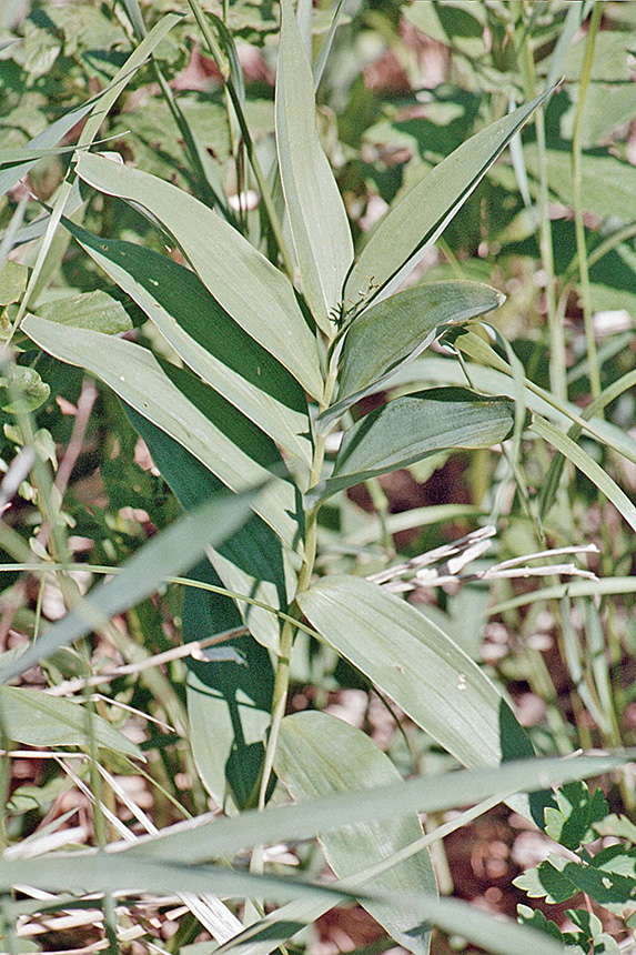 Common false Solomon’s seal (Maianthemum racemosum var. racemosum) is a slightly taller plant, reaching up to 30″ at maturity. The leaves are broader, egg-shaped to elliptic, and are not stiff or folded. The inflorescence is a plume-like, branched panicle of 20 to 80 tiny flowers. The flowers are about ⅛″ wide. The fruits are smaller and are green with copper spots when young. Hairy Solomon’s seal (Polygonatum pubescens) is a taller plant, reaching up to 36″ at maturity. The stem is arching. The leaves are broader, are on short stalks, and are not stiff or folded. The inflorescence is small clusters of cylinder-shaped flowers hanging downward from most leaf axils. The fruits are green when young and dark blue-violet when mature. Large-flowered bellwort (Uvularia grandifloria) leaves are perfoliate. The inflorescence is 1 to 3 solitary flowers that appear to hang downward from leaf axils. The flowers are bell-shaped, 1″ to 2″ long, and bright yellow. The fruit is a 3-celled, greenish to yellowish-brown capsule. Rose twisted-stalk (Streptopus lanceolatus var. longipes) is a taller plant, reaching up to 36″ at maturity. The stem is hairy, branching, and jointed at the leaf axils giving it a zigzag appearance. The leaves do not clasp the stem. The flowers are dark rose-purple to pink and bell-shaped. They hang downward from leaf axils singly on stems up to 2″ long that are twisted or have an abrupt bend in the middle. The fruit is bright red. Smooth Solomon’s seal (Polygonatum biflorum var. commutatum) is a much taller plant, reaching up to 48″ at maturity. The stem is arching. The leaves are broader and are not stiff or folded. The inflorescence is small clusters of cylinder-shaped flowers hanging downward from most leaf axils. The fruits are green when young and blackish red when mature. |