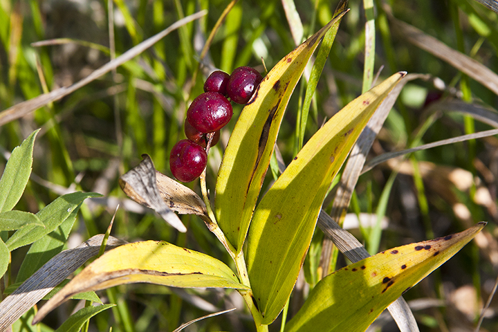 Sep 23, 2015 Found on Vallee-Lourdes Drive, Bathurst, NB, Canada FLOWER: Spike-like raceme 1 to 4 inches long of up to 20 stalked white flowers. Each flower is about 3/8 inch across, has 6 tepals (petals) and 6 stamens with pale yellow or cream-colored tips. LEAVES: Leaves are up to 6 inches long and 2 inches across, generally elliptical tapering to a point at the tip, toothless, finely hairy on the underside, with prominent parallel veins and often folded some lengthwise. The base of the leaf clasps the stem. The stem slightly zig-zags between the alternately attached leaves and may be hairless or finely hairy. The plant does not grow upright but tilts to one side and arcs a bit at the top. FRUIT: Each flower is replaced by a berry, about ¼ inch in diameter. Berries are initially green with purple stripes and ripen to solid reddish-purple. Native in my area, and throughout North America, but again, DO NOT EAT THE BERRIES. Leaves and stems are also poisonous and can leave you feeling rather ill. NOTES: Just looking at the leaves, Smooth Solomon's Seal, False Solomon's Seal, and Starry False Solomon's Seal are all similar. False Solomon's Seal prefers shadier habitats, has more, smaller flowers, plus its leaves do not clasp the stem and are wider than Starry False Solomon's Seal. Smooth Solomon's Seal has racemes of flowers on the underside of the arcing stem, rather than a cluster at the end. Starry False Solomon's Seal often goes by Latin name Smilacina stellata but the accepted name in Minnesota is Maianthemum stellatum. Formerly in the Liliaceae (Lily) family, all Maianthemum species have been reassigned to Ruscaceae (Butcher's Broom). |