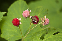 Thimbleberry is an erect perennial shrub that rises from an underground horizontal stem (rhizome). It can be 40″ to 80″ long, though in Minnesota it is usually no more than 18″ to 48″ in height. It often forms large, dense clumps. A series of biennial stems (canes) are sent up from the perennial rhizome. The canes are erect to ascending, and unbranched. They do not have bristles or prickles. In the first year they are green and are covered with glandular hairs. In the second year they are woody and hairless and the bark is thin, tan, papery, and flaky. The leaves are large, alternate, deciduous, and long stalked. The leaf stalks are 2¼″ to 7″ long and are covered with reddish, gland-tipped hairs. At the base of each leaf stalk there is a pair of leaf-like appendages (stipules). The stipules are lance-shaped and ¼″ to ¾″ long. The leaf blades are velvety to the touch, round to kidney-shaped in outline and about as long as wide. They are usually 4″ to 8″ long, sometimes up to 12″ long. They and are heart-shaped or deeply cut at the base, and are palmately cut into usually 5, sometimes 3, shallow, pointed lobes. The lobes are cut no more than one third of the way to the midvein. The upper surface is green and sparsely to densely covered with short hairs. The lower surface is somewhat lighter green and similarly hairy but with glandular hairs along the main veins. The margins are irregularly toothed or double toothed with sharp, forward-pointing teeth. The inflorescence is either a single flower or a long-stalked, leafy, flat-topped cluster (corymb) with 2 to 10 large flowers at the end of the stem. They appear from May to late July, peaking in late June to late July. Each flower is in a ⅜″ to 1½″ long stalk (pedicel). The pedicel is densely covered with glandular hairs. The flowers are 1⅜″to 2″ in diameter. There are 5 sepals, 5 petals, and numerous stamens. The sepals are green, egg-shaped to triangular, and have a narrow, elongated, tail-like tip. They are ⅜″ to 11 ⁄16″long including the tip. They are covered on the back (outside) with very short, orangish-yellow, gland-tipped hairs; and on the inside with white non-glandular hairs. The petals are white, broadly egg-shaped to nearly circular, and ⅝″to 1″ long. They have a texture like crinkled tissue paper. The stamens are pale yellow. The fruit is a juicy, fuzzy, broadly hemispheric, ⅝″ to ¾″ wide aggregate of multiple drupelets. It is initially pinkish-white, becoming progressively darker pink, eventually bright red when ripe. It matures in early August to mid-September. When ripe it falls intact to the ground. |