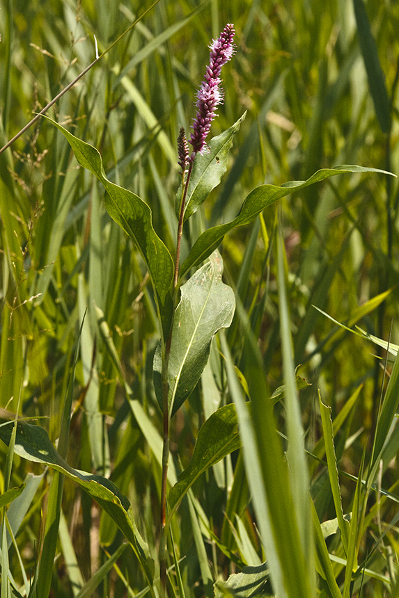 Water smartweed may be floating on water (aquatic), rising out of standing water (emergent), or growing in periodically inundated or merely permanently moist areas (terrestrial). The upper surface of the leaves are shiny. The inflorescence is long and is interrupted near the base. The flowers are pink to red. |