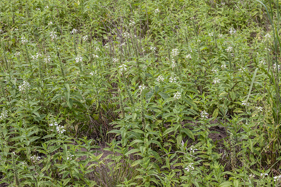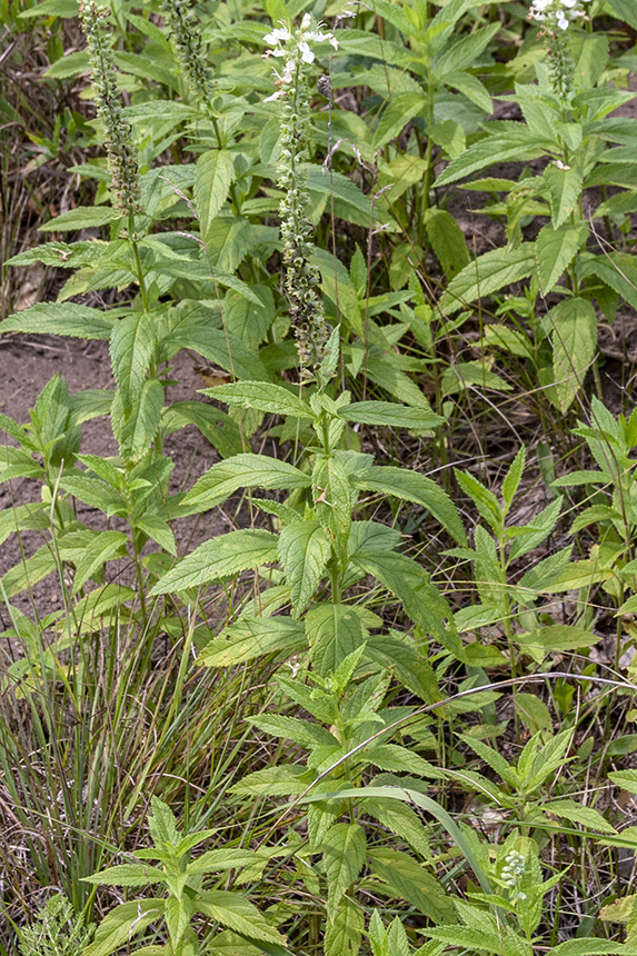 American germander (Teucrium canadense var. canadense) leaves have curled or crooked hairs on the lower leaf surface. None of the hairs, even in the inflorescence, are gland-tipped. |
