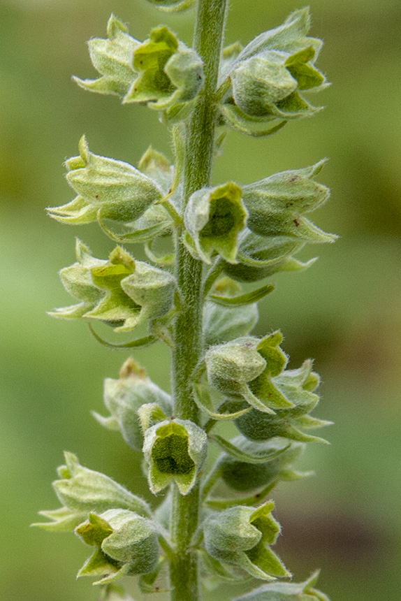 The leaves have straight and spreading hairs on the lower surface. Many of the hairs, especially in the inflorescence, are gland-tipped. The flowers are not hooded. |