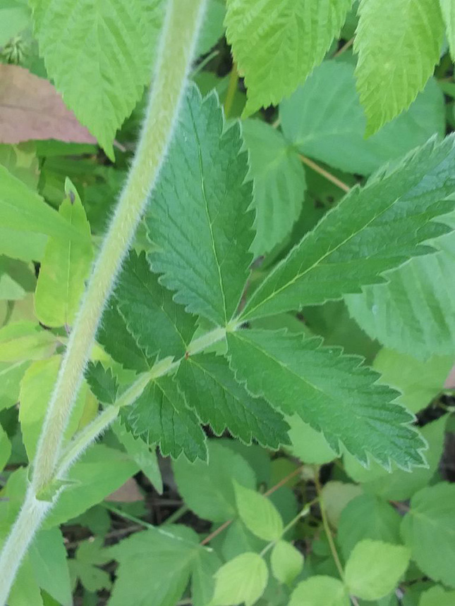 Large-leaved avens (Geum macrophyllum var. perincisum) lower stem is densely hairy. The terminal segment of basal leaves is round to kidney-shaped and larger, 2″ to 4¾″ wide. The lateral leaflets are much smaller. The petals are yellow. Yellow avens (Geum aleppicum) stems are stout. The lower stem is densely hairy. Lower stem leaves are pinnately divided into 5 or more leaflets. There are often minute, minor leaflets between the principal leaflets. The petals are yellow. It is found in wet areas. |