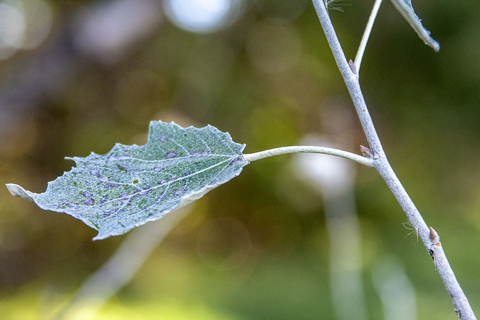 Introduced tree 5-20 m tall, leaves distinctively with white tomentose undersurfaces, often escaping cultivation along riparian corridors. Although the leaves may look maple-like (palmately lobed), Populus does not have opposite branching. |