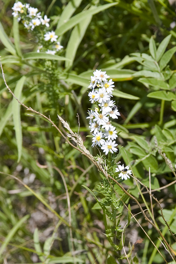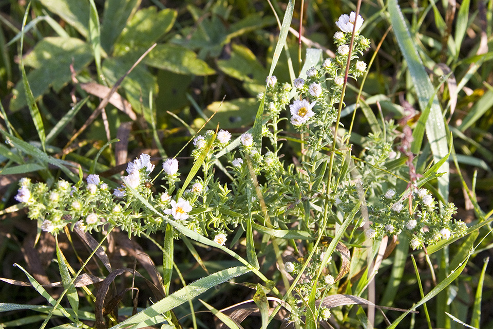 White prairie aster (var. commutatum) is an erect, perennial forb. It usually rises a single stem from a long rhizome. Sometimes it rises on 2 to 5 or more clumped stems from a group of short, entangled rhizomes. New shoots develop at the end of elongated rhizomes. A mature plant can be from 4″ to 31″ tall, though in Minnesota it is usually no more than 24″ in height. It is usually found in colonies. The stem is ascending to erect, grayish-brown to brown, and usually branched above the middle. It is usually densely covered with short, upward-curved hairs. The stem is green when young, becoming grayish-brown to brown when the plant matures. Basal leaves are ⅜″ to 1½″ long, ⅛″ to ⅜″ wide, inversely lance-shaped, firm, and stalkless. They are tapered at the base and rounded or angled at the tip with an abrupt, short, sharp, hard point at the tip. The upper and lower surfaces are rough to the touch and usually sparsely to moderately covered with straight, stiff, sharp, appressed hairs. The margins are usually untoothed and have a fringe of spreading or forward-pointing hairs. By the time the plant is in flower the basal leaves have withered. Lower stem leaves similar to basal, alternate, inversely lance-shaped to oblong, ⅜″ to 1½″ long or longer, 1 ⁄16″ to ⅛″ wide or wider, becoming progressively smaller as they ascend the stem. They are wedge-shaped at the base, rough to the touch, and are sparsely to densely covered with straight, stiff, sharp, appressed hairs. Upper stem leaves similar to lower, linear oblong to linear lance-shaped, 1″ to 1¾″ long, and 1 ⁄16″ to ⅛″ wide. Leaves on the branches are evenly distributed around the branch, notarranged on one side of the branch. The inflorescence is an elongated, branched cluster (panicle) of usually 10 to 200 or more flower heads at the end of the stem and branches. The panicles have short to long, ascending branches with 1 or a cluster of 2 to 10 or more uncrowded flower heads per branch. The flower heads are usually clustered at the end of the panicle branch, and are not arranged on one side of the branch. The flower heads and clusters are on stout, up to 2″ long stalks (peduncles). The stalks have 2 to 10 or more somewhat leaf-like bracts. The bracts are ⅛″ to 5 ⁄16″ long, linear to lance-shaped, and densely hairy. The flower heads are ⅜″ to ¾″ in diameter. The whorl of smaller bracts subtending the flower head (involucre) is bell-shaped. The bracts of the involucre are linear lance-shaped to oblong inversely lance-shaped, thickened toward the base, abruptly bent backward, and tapered at the tip with a short, sharp, spine-like point at the tip. The margins of the bracts have a dense fringe of spreading hairs. The flower heads have 15 to 35 (usually at least 20) ray florets and 8 to 30 (usually at least 18) yellow disk florets. The ray florets are usually white, rarely pink or blue. The disk florets become brown with age. The fruit is an achene with a tuft of whitish hairs at the tip. |