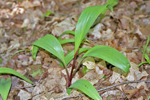 This species is distinguished from other Allium species by the leaves that disappear by flowering time. The leaves are also wider than those of any other Allium species in Minnesota. Narrow-leaved wild leek (Allium burdickii), as its common name indicates, has narrower leaves, ¾″ to 1¼″ wide. They are nearly stalkless or on much shorter leaf stalks, and the stalks are green, not reddish. The bulbs are shorter, ¾″ to 1½″ tall. The scape is much shorter, 5″ to 6¼″ tall. The spathe bracts are smaller, ⅜″ to ¾″ long. The umbel has 12 to 18 individual flowers. Lily of the valley (Convallaria majalis) has similar leaves but they are shorter, 6″ to 9″, and much wider, 1″ to 5″ wide. The inflorescence is a loose, elongated clusted of nodding flowers. |