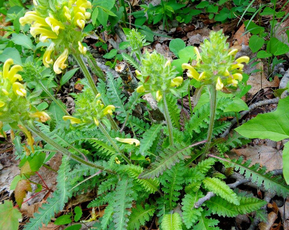 Wood betony, also called Canadian lousewort, is a 4″ to 16″ tall, erect, perennial forb that rises on 1 or more stems from short rhizomes. It forms large clumps. The stems are erect, hollow, unbranched, green or reddish brown, and hairy with long soft hairs. The leaves are mostly basal. Basal leaves are crowded and form a rosette. They are on stalks that are often longer than the leaf blades. They are inversely lance-shaped with the attachment at the narrow end, up to 6″ long and 1″ wide. They are fern-like in appearance, cut with deep, rounded lobes cut more than half way to the midrib (pinnatifid). The upper surface is deep green, hairless except with appressed hairs along the sunken midrib, with indented (impressed) lateral veins. The lower surface is lighter green, hairless, with raised (prominent) lateral veins. The margins of the lobes have fine, rounded teeth. Stem leaves are alternate and similar to the basal leaves but smaller and on shorter leaf stalks. They are 1⅛″ to 2⅓″ long, and ⅜″ to ¾″ wide. Lower leaves are on long leaf stalks. Leaves become smaller and leaf stalks shorter as they ascend the stem. Upper leaves are stalkless. The inflorescence is a 1″ to 2″ long, cone-shaped spike at the end of the stem and sometimes also from upper leaf axils. They have a conspicuous pinwheel arrangement, with the flowers sticking out at right angles to the central axis. The individual flowers are stalkless and subtended by a single leaf-like bract. The calyx is ⅓″ to ½″ long with 2 spreading, rounded lobes. There are 5 yellow petals forming a ⅔″ to 1″ long, tubular, 2-lipped corolla. The upper 2 petals are fused into convex, one-lobed, hood-like lip (galea) from which the pistil protrudes. The hood is sometimes reddish or purplish tinged. There are 2 small teeth just below the tip of the galea. The lower 3 petals are fused into a banner that is shorter than the galea and has 3 lobes, the 2 lateral lobes rounded, spreading, and longer than the middle lobe. The 4 stamens are contained within the galea. The fruit is a dry, egg-shaped capsule, 2 ⁄5″ to 3 ⁄5″ long, with uneven sides. It is twice the length of the calyx. When in fruit the spike elongates to up to 8″. |