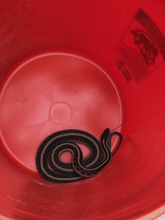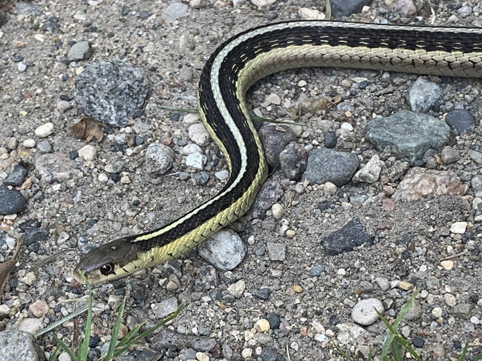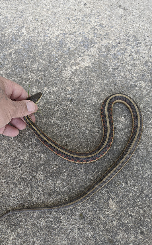 Red sided garter snake near my house in a trench under sod pieces. Relocated to Quarry Hill. |