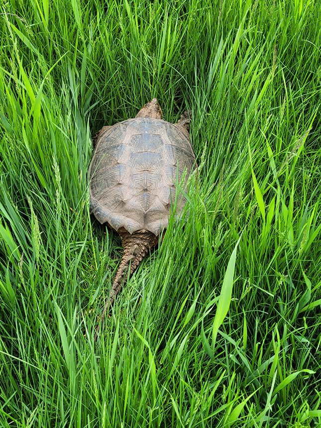 Location: between Twin Valley and Ada, Mn I came across this snapping turtle on a county highway between Twin Valley and Ada, Mn. on May 28, 2019. It just sat on the road and I seen a couple vehicles go around it. I pulled into an approach and decided to try get it off the road so it wouldn’t get ran over. I figured it could possibly be a female heading to a certain spot to lay its eggs. Though not sure. Anyway all the while watching for any vehicles coming I gave a slight nudge to the turtle near its tail end. I just tried to slowly turn around toward me. I knew not to try pick one up and not having any luck getting it to move looked in the ditch and found a sturdy stick. I still had a time getting it off the road and at times pushed it a little with the stick. Anyway got it off the road into the ditch it was heading to. Snapping turtles kind of remind me of a reptile of back in the dinosaur days. |