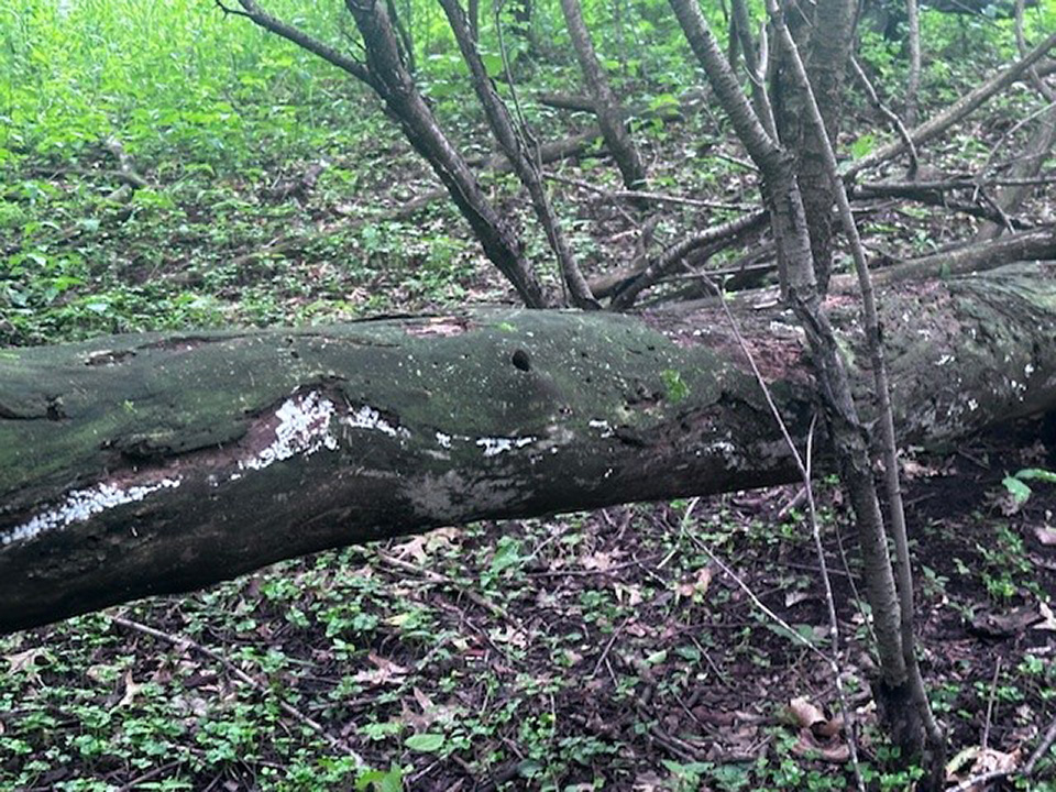 Protostelid slime molds are relatively unknown and easily overlooked. They were first recognized in the early 1960s and have been little studied since. There are 36 currently accepted species, and possibly twice that number of undescribed species. Most are microscopic. Only a few are visible to the naked eye. Honeycomb coral slime mold, also called simply coral slime, is the most commonly encountered protostelid slime mold and may be the most common slime mold of any kind in the world. It occurs on every continent except Greenland and Antarctica. In the United States it is common east of the Great Plains, including Minnesota, and west of the Rocky Mountains. It is absent in the arid west. It is found on shaded rotting wood of fallen logs and branches, in open, wet to moderately moist deciduous, coniferous, and mixed forests. It does not feed on the wood but on bacteria associated with the rotting wood. It can form extensive colonies one meter or more long. It is very short lived, appearing after a soaking rain and disintegrating in just a few days. Honeycomb coral slime mold first appears as a thin, watery, translucent, mucus-like layer of protoplasm (plasmodium). It creeps across the substrate, engulfing bacteria, protozoa, and particles of nonliving organic matter. Eventually, the plasmodium fruits, converting to spore-bearing structures (sporocarps). The conversion takes about six hours. The sporocarps are erect, slender, translucent columns appearing usually in clusters of three or more. The clusters often form patches 4″ or more in diameter. The columns are 1 ⁄32″ to ⅜″ (1 to 10 mm) long, 1 ⁄64″ to 3 ⁄64″ (0.5 to 1.0 mm) in diameter, and tapered. They may be branched or unbranched. When they first appear they are slimy, translucent, and usually white, rarely pink or yellow. Later, they have a frosted or powdery appearance due to a dense covering of tiny, white, spores on long, thread-like stalks. The spores may actually be one-celled sporangia. It is not edible. |