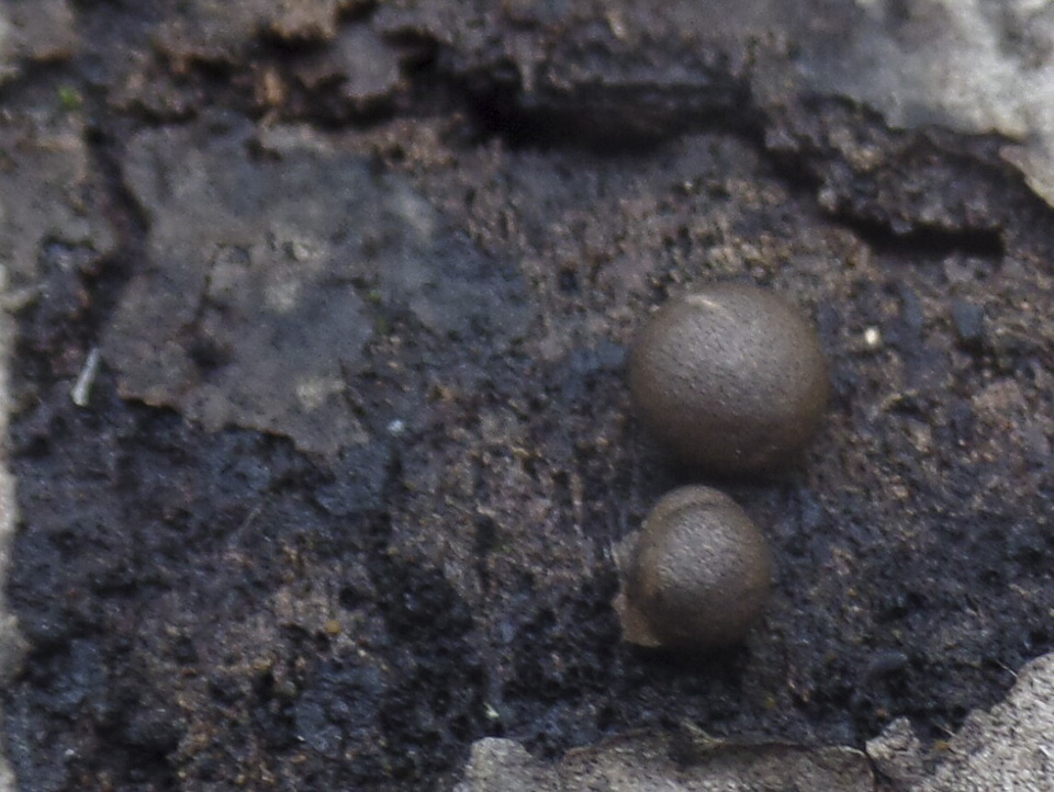 Wolf’s milk slime mold is a common and widespread plasmodial slime mold. It is found from June through November, usually in groups, sometimes scattered, on well rotted logs and other dead wood. The fruiting body is a plump, pillow-like mass (aethalium) of protoplasm enclosed in an surface crust. It looks like a small puffball. Each aethalium is globe-shaped to hemispherical and ⅛″ to ⅝″ in diameter. It is pink at first and filled with a pink paste that has a texture often compared to toothpaste. As it matures it becomes yellowish-brown to olive brown, darkening as it ages. The interior of a mature aethalium is a dry, powdery, pinkish-gray mass of spores. It is not edible. |
