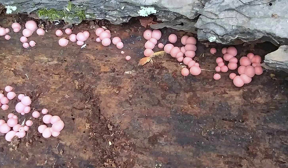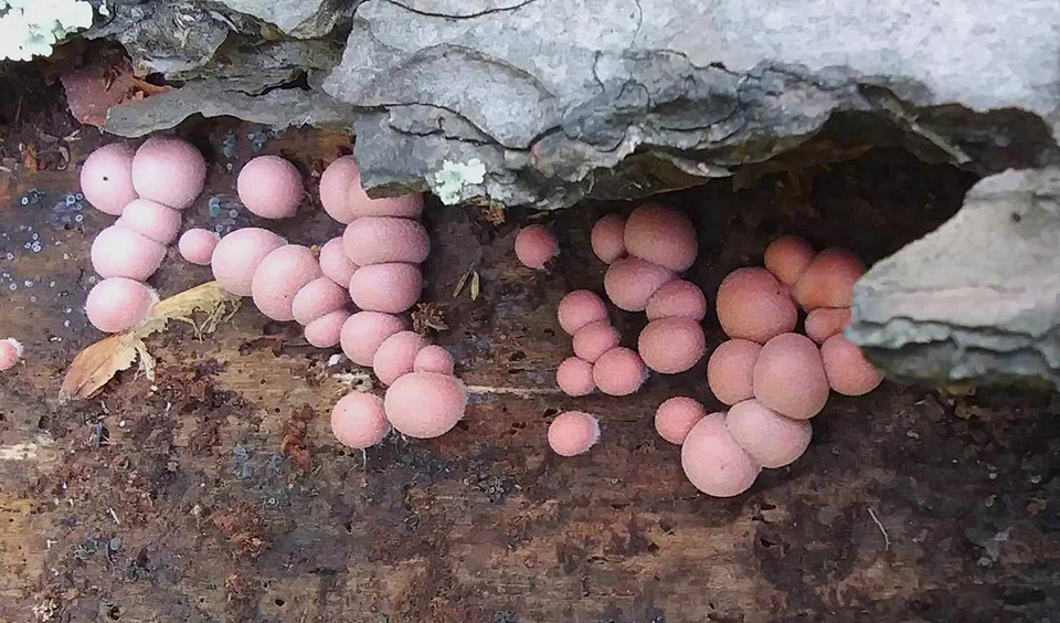 Published on Oct 30, 2014 These pink blobs represent huge single celled Wolf's Milk or Wolf's Blood slime molds with thousands of nuclei that reach this size following long periods of feeding on bacteria, yeast, etc. The feeding stage is called a syncytium and the aethial stage is the reproductive stage where the mold goes a brown colour and changes into thousands of spores that are dispersed by wind, rain, etc. |