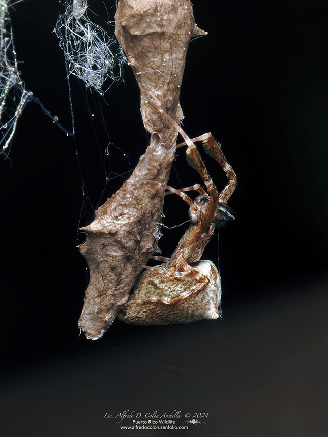 The web itself is a typically vertical orb. The frame and the “spokes” (radii) are constructed with smooth structural silk, while the inner capture spiral consists of the cribellate silk. Because this spider lacks venom glands, it must work quickly once an insect is snagged, rushing from the hub to wrap the prey in a dense silk shroud to immobilize it. To feed, the spider regurgitates digestive enzymes onto the prey and ingests the liquefied remains.