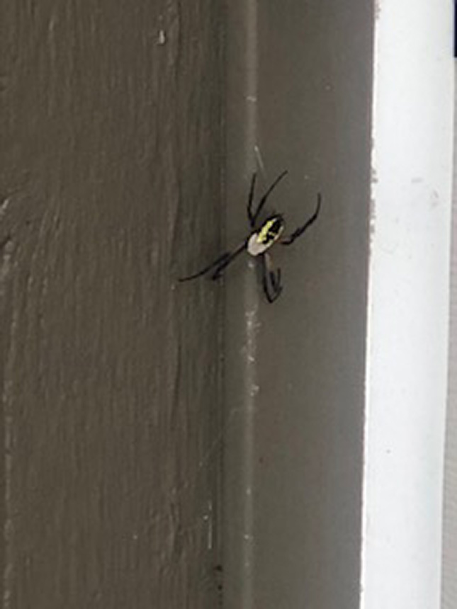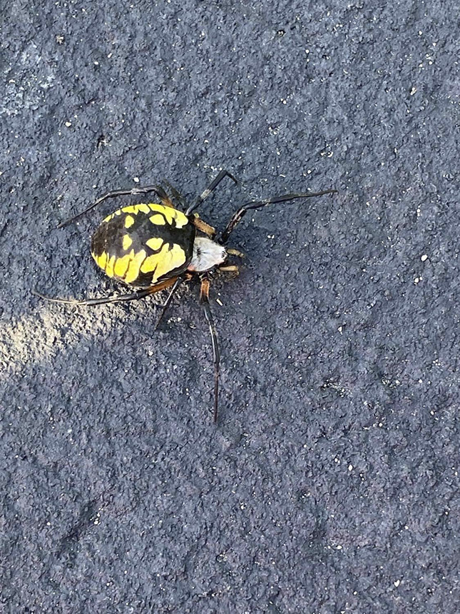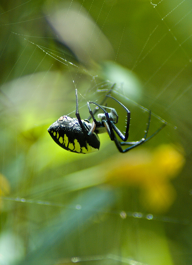 The abdomen is egg-shaped and black. There is a vertical row of bold yellow spots on each side of the abdomen and two or three pairs of yellow spots in the middle.
