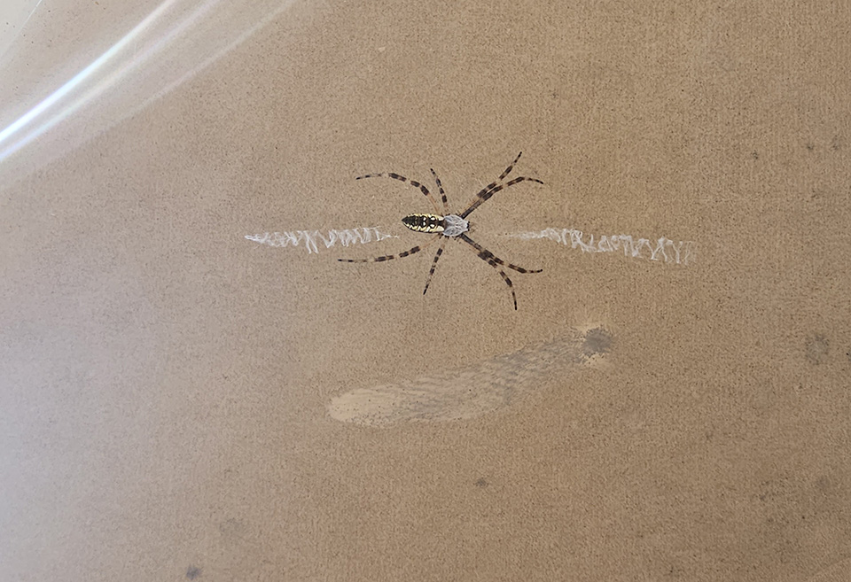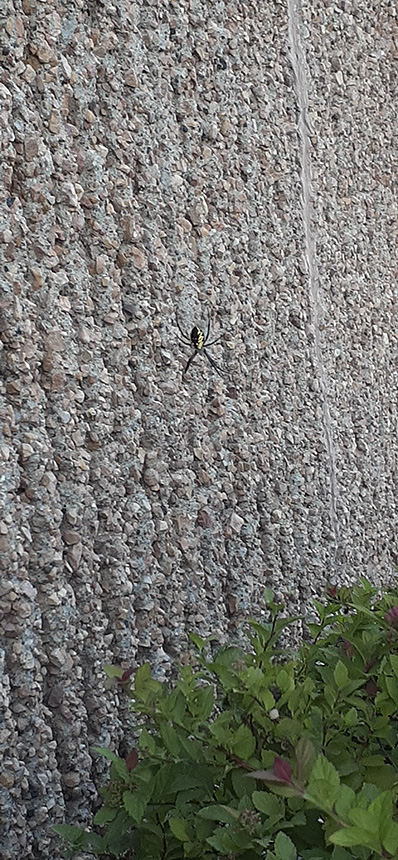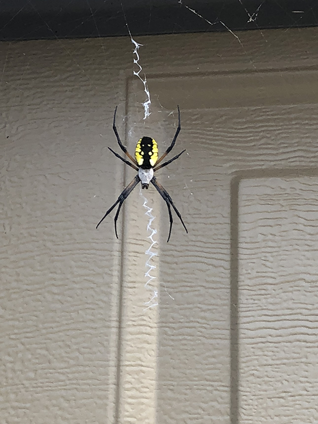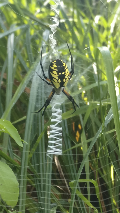 The web is constructed vertically in a sunny location with a nearby retreat. It is flat, circular, and up to 24″ or more in diameter, with 30 to 50 lines (spokes) radiating from the center. It is decorated with a pair conspicuous, zigzag, vertical lines (stabilimenta), one above and one below the center. The stabilimenta are made of multiple threads of non-sticky silk.