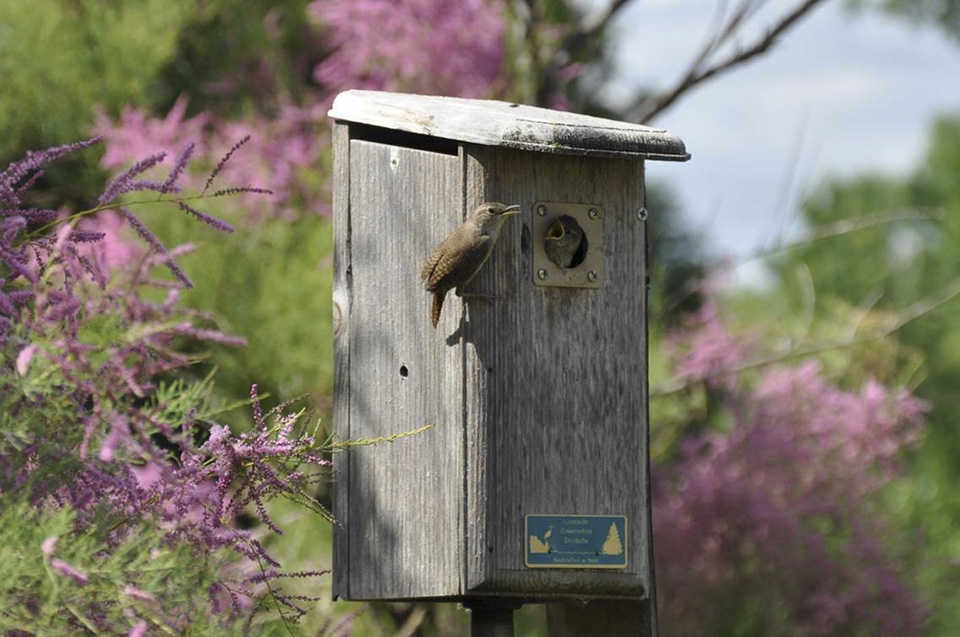 Location: Maple Grove, MN Wren feeding chick, July 2016, surrounded by my tall Queen of the Prairie plants. |