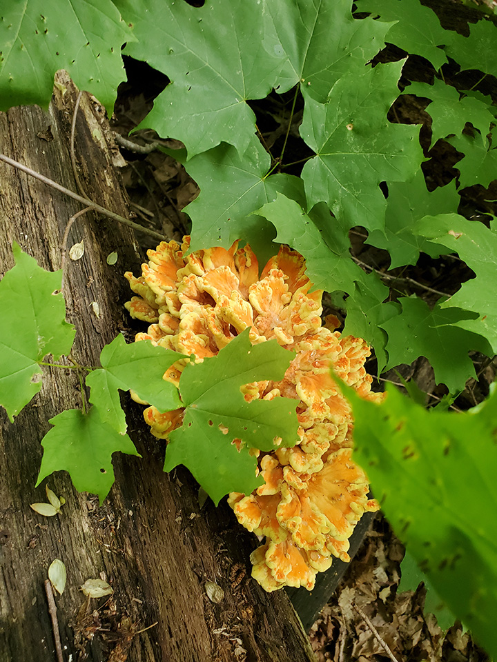 Chicken of the Woods is a large, common, widespread, fleshy, bracket (shelf-like) fungus. It is one of the “Foolproof Four”, the four most easily identified mushrooms. It is usually saprobic, on decaying stumps and logs, but is sometimes parasitic, on the sides of injured trees. It enters the tree through a wound and infects the heartwood causing brown rot.