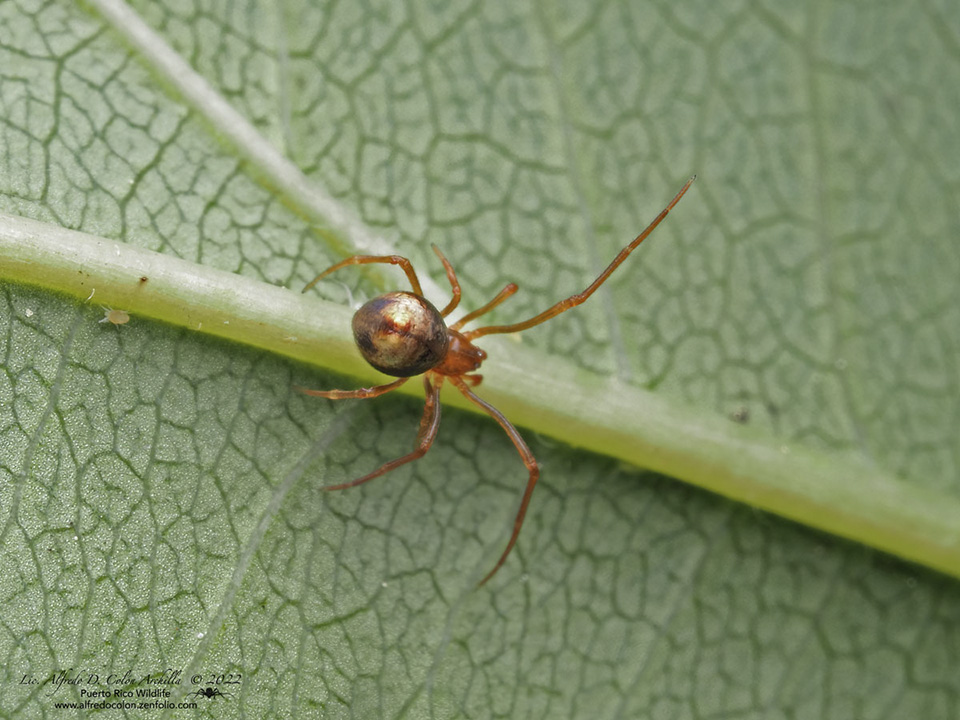 Horned parasitic cobweaver is a very small, kleptoparasitic spider. It occurs in the United States and southern Canada east of the Great Plains. It is found in a wide range of natural habitats, including forests, woodlands, shrubby areas, edges of ponds and wetlands, field margins, trails, and roads bordered by low vegetation. It is also found in human-altered (anthropogenic) environments, including gardens, old fields, sheds, house walls, and other built structures.