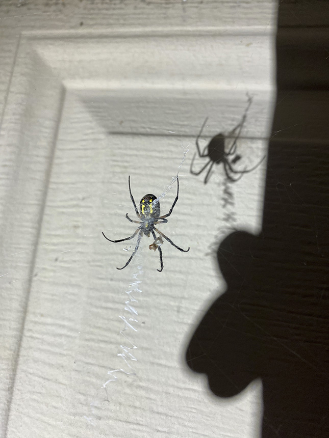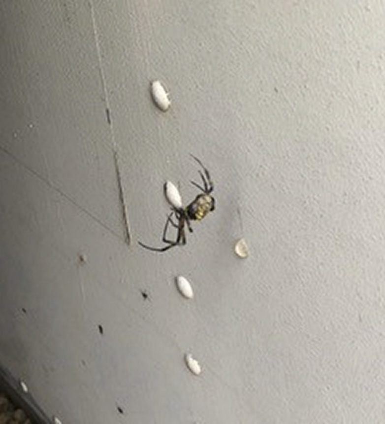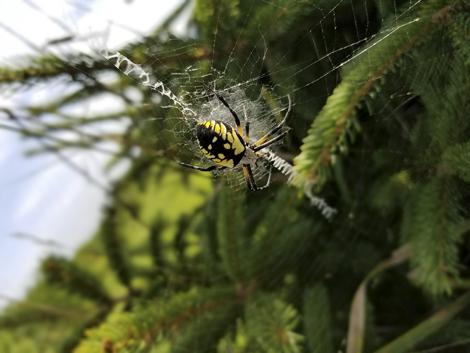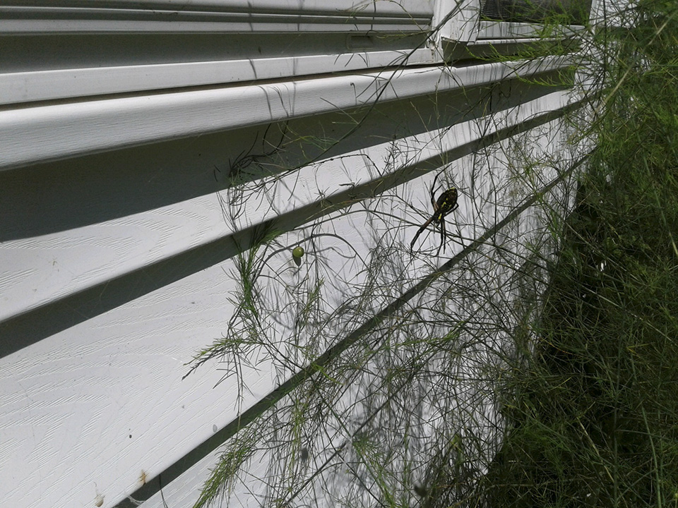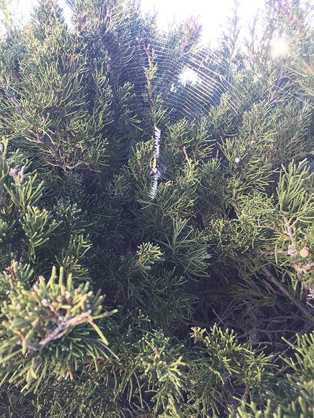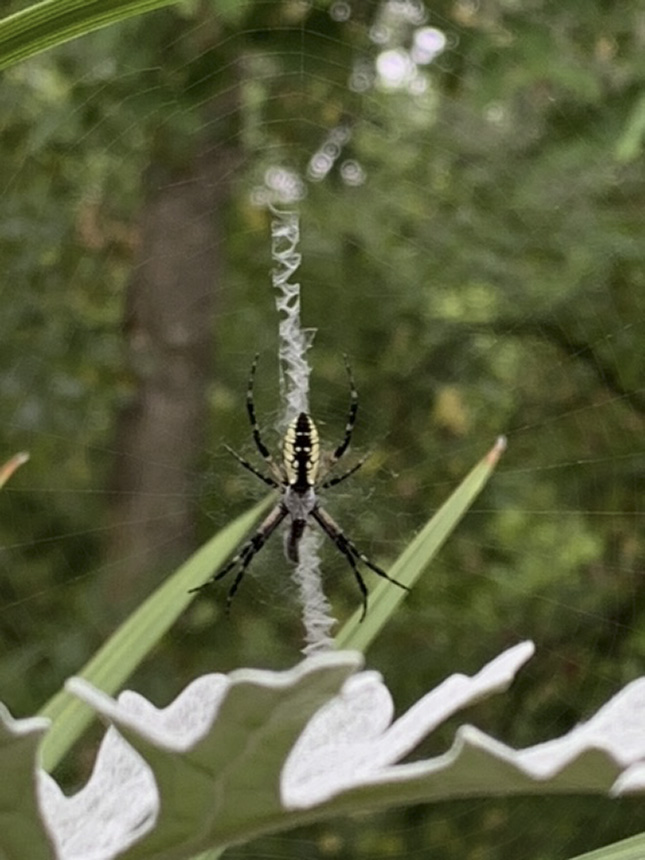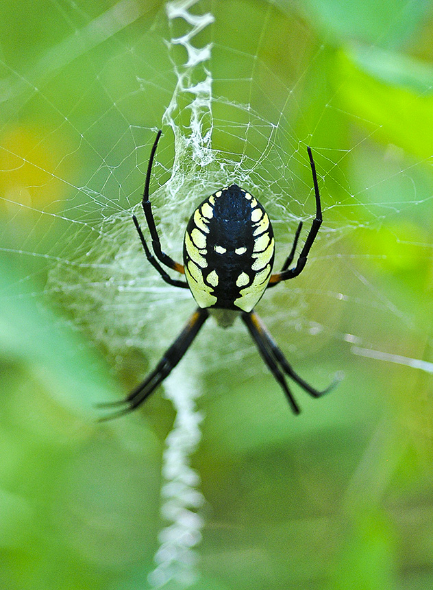 The web is constructed vertically in a sunny location with a nearby retreat. It is flat, circular, and up to 24″ or more in diameter, with 30 to 50 lines (spokes) radiating from the center. It is decorated with a pair conspicuous, zigzag, vertical lines (stabilimenta), one above and one below the center. The stabilimenta are made of multiple threads of non-sticky silk.