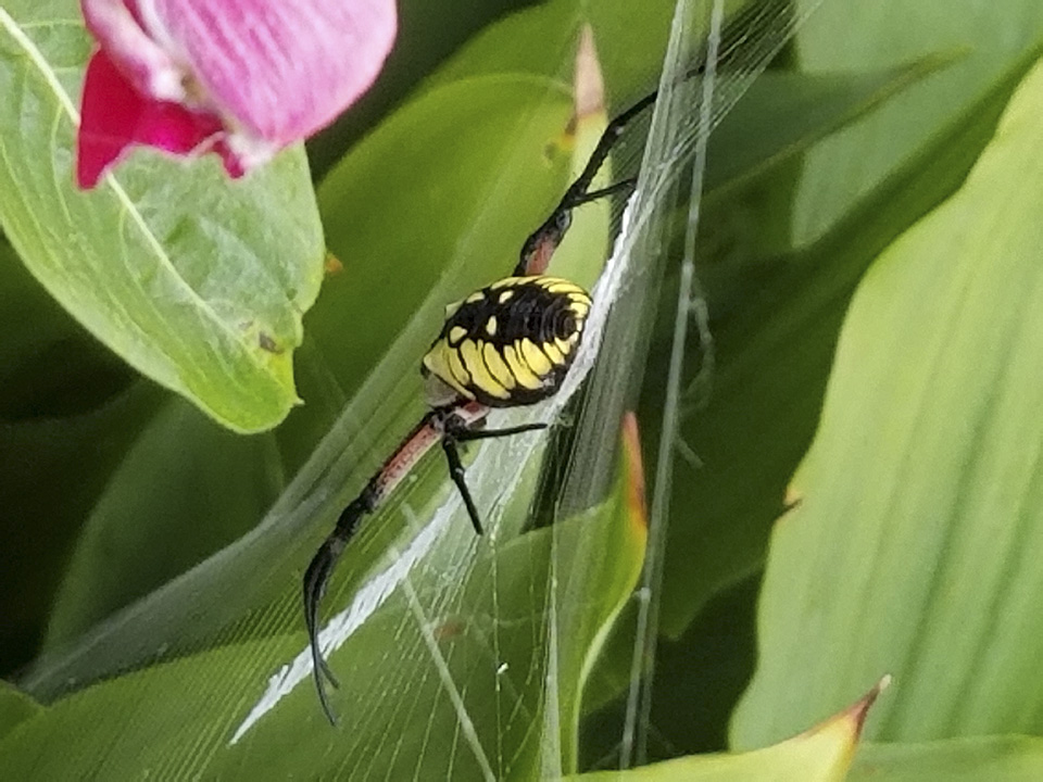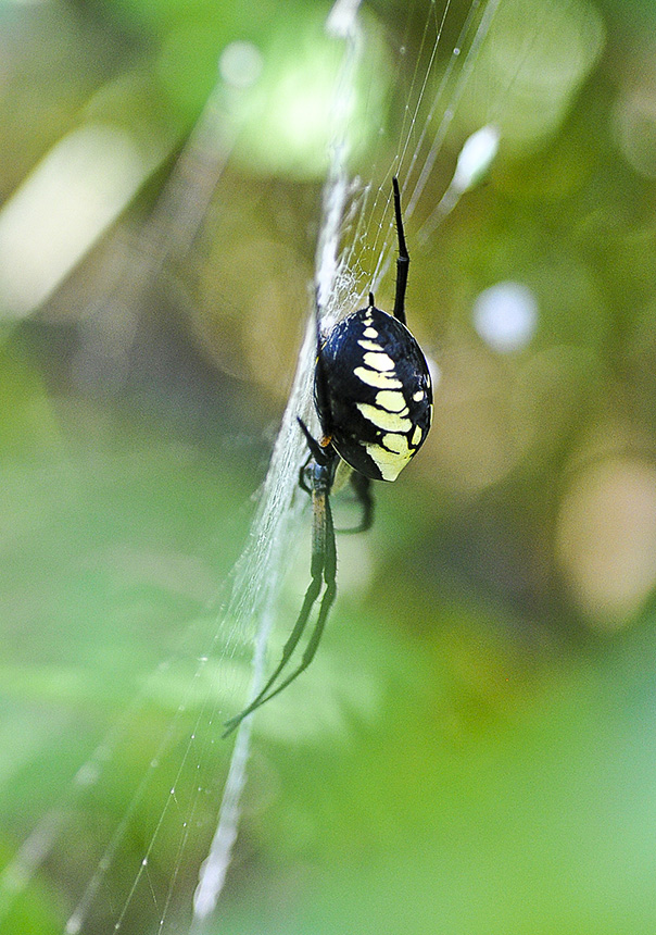 Adults are active day and night. The female sits head down in the center of her web, or concealed nearby in a rolled leaf, waiting for prey to be caught in the web.