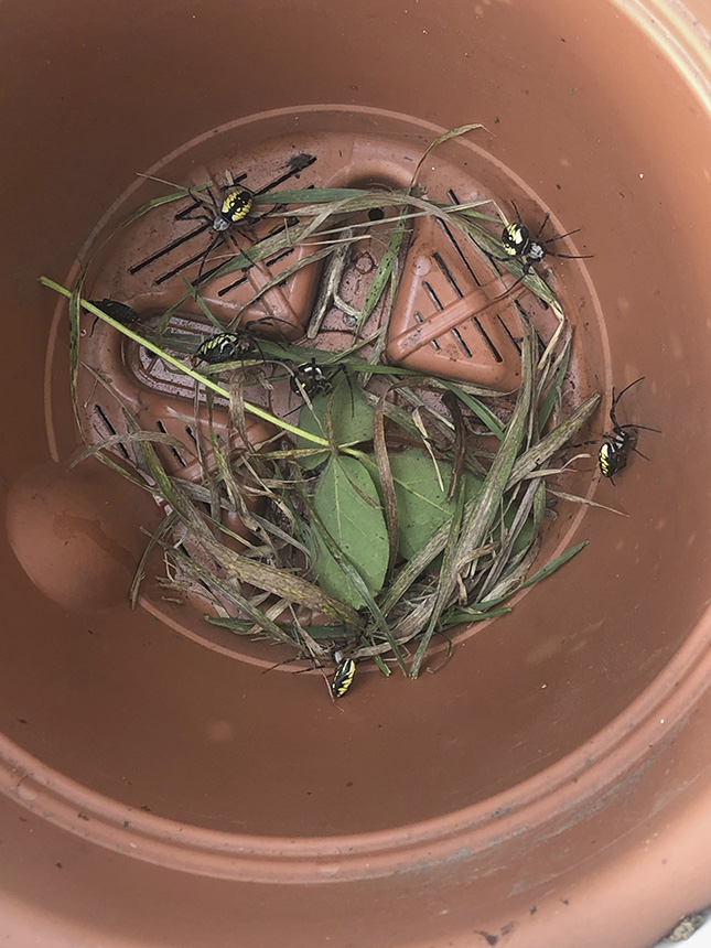 The abdomen is egg-shaped and black. There is a vertical row of bold yellow spots on each side of the abdomen and two or three pairs of yellow spots in the middle.