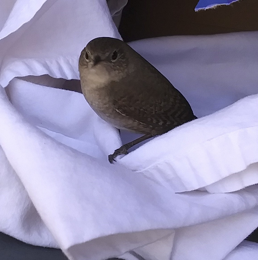 Location: Lake Shore, MN This little wren had a little bump with the window. Gave it a resting area and was soon ready to fly away. |