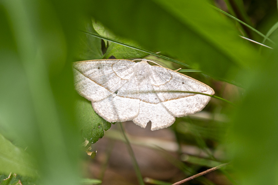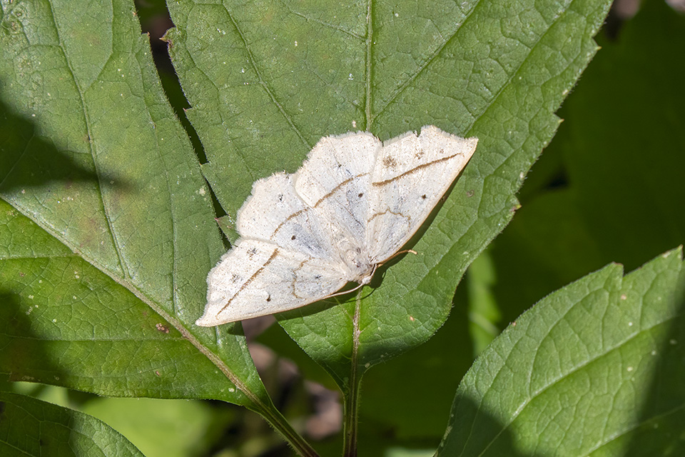Confused eusarca is a common, medium-sized, typical geometer moth. It occurs in the United States and southern Canada east of the Great Plains, and there are several scattered records in the southwest. It also occurs in Mexico and Central America. It is common in Minnesota. Adults are found from June through August in meadows and fields. The larvae feed on the leaves of many species of forbs, especially those in the aster (Asteraceae) family, including on aster, dandelion, and goldenrod, but it has also been reported on clover and knotweed. Adults have a 1⅛″ to 1⅝″ (29 to 41 mm) wingspan. The forewings are broad and pale gray or light yellowish-brown with a variable amount of grayish-brown dusting. On some individuals, the entire median area is darker. The antemedial (AM) and postmedial (PM) lines are dark. The AM line is faint and rounded. The PM line is distinct, straight and oblique. It begins at the inner margin about two-thirds distance from the base and fades out or bends inward just before reaching the leading edge (costal margin) near the wingtip. On darker individuals, it is edged with yellow. The discal spot is small, black, and about equidistant between the AM and PM lines. The hindwings are similar but lack an AM line. |